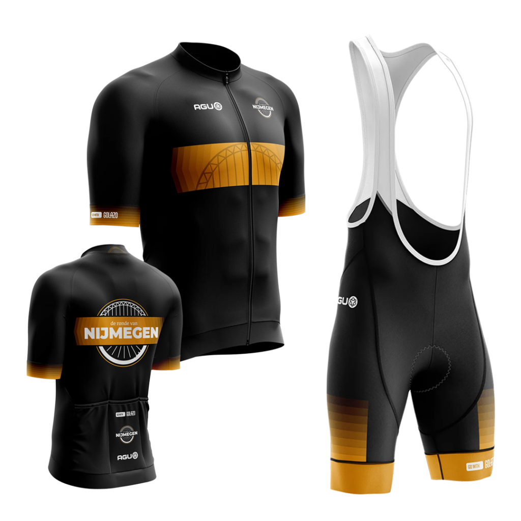 Rijd op 9 mei in het officiële AGU Custom-tenue van de Ronde van Nijmegen. De iconische Waalbrug siert het ontwerp als eerbetoon aan de oudste stad van Nederland. De krachtige combinatie van zwart met gele accenten maakt dit shirt een echte blikvanger – een uniek aandenken aan jouw tocht door de keizerstad!